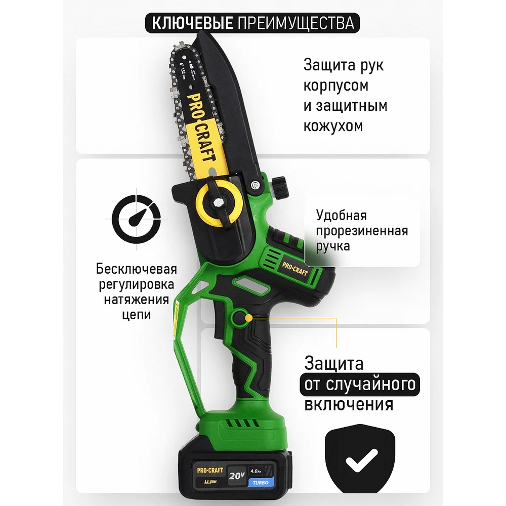 Купить Пила цепная аккумуляторная PROCRAFT 20В 6'/8' 2 Шины+ 2 Цепи, АКБ 4Ач+ЗУ PKA32Li по лучшей цене с доставкой - интернет магазин №1 в России