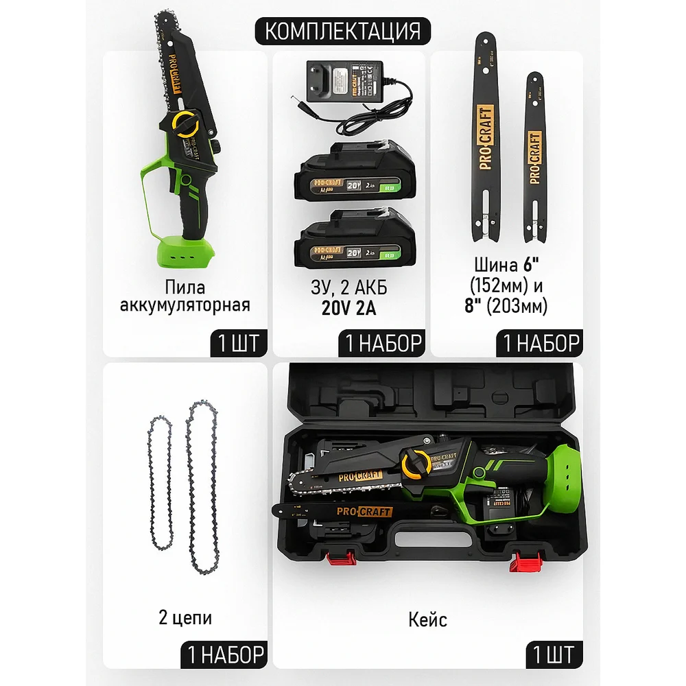 Пила цепная аккумуляторная PROCRAFT 20В, 6''+8'', 4600 об/мин, АКБ 2Ач+ЗУ+2, Шина+2 Цепи, Кейс, PKA46 2/2