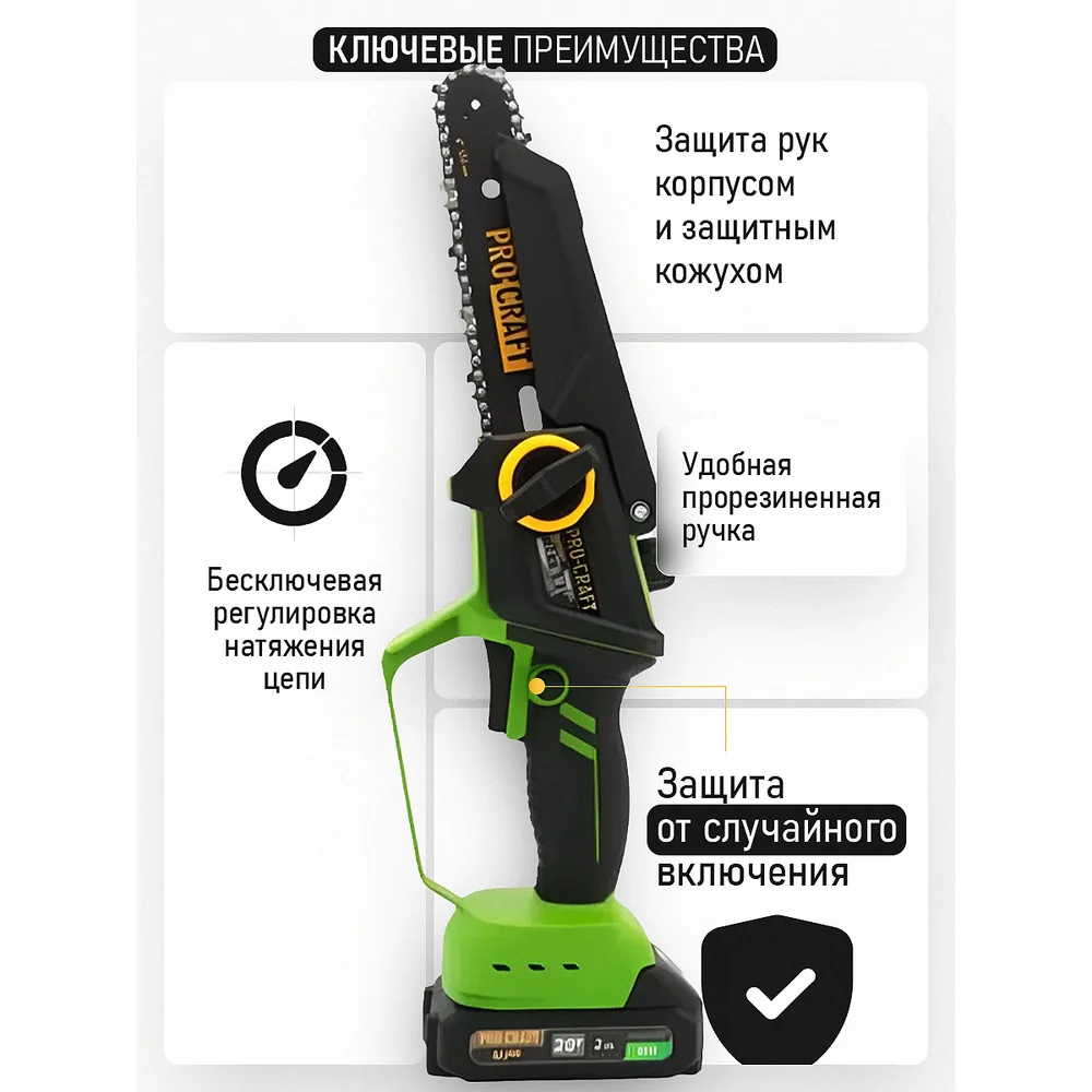 Купить Пила цепная аккумуляторная PROCRAFT 20В, 6''+8'', 4600 об/мин, АКБ 2Ач+ЗУ+2, Шина+2 Цепи, Кейс, PKA46 2/2 по лучшей цене с доставкой - интернет магазин №1 в России