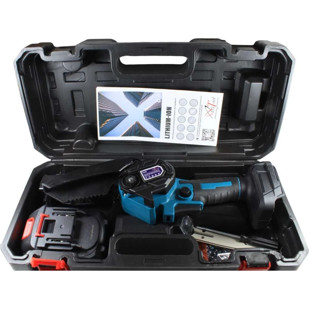 Комплектация Пила; Кейс; Аккумулятор; Зарядное устройство; Защитный кожух; Отвертка для регулировки уровня натяжения