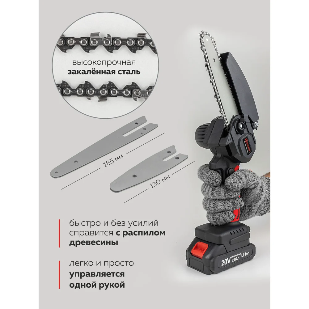 Комплектация Цепная пила; Зарядное устройство; Аккумулятор 20В 2000мАч; Полотно для цепи длина 185мм 1 шт., Полотно для цепи, длина 130мм 1 шт; Цепь (длина 4", 28 звеньев, шаг цепи 1/4", ширина звена 1.1мм, ширина цепи 5/32"(4мм), угол заточки 30 град); Цепь (длина 6", 36 звеньев, шаг цепи 1/4", ширина звена 1.1мм, ширина цепи 5/32"(4мм), угол заточки 30 град.); Отвертка переставная двухсторонняя (SL5 - PH1); Пластиковый кейс