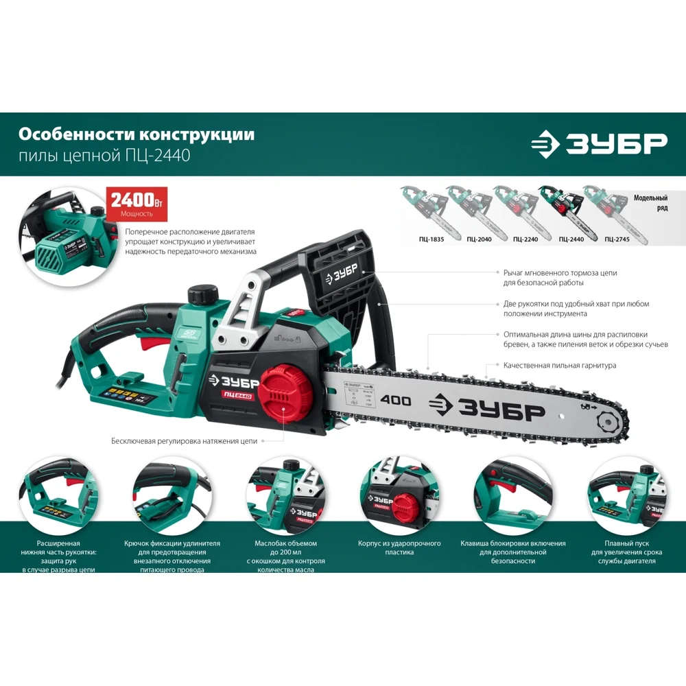 Купить Цепная электрическая пила ЗУБР 2400 Вт ПЦ-2440 по лучшей цене с доставкой - интернет магазин №1 в России